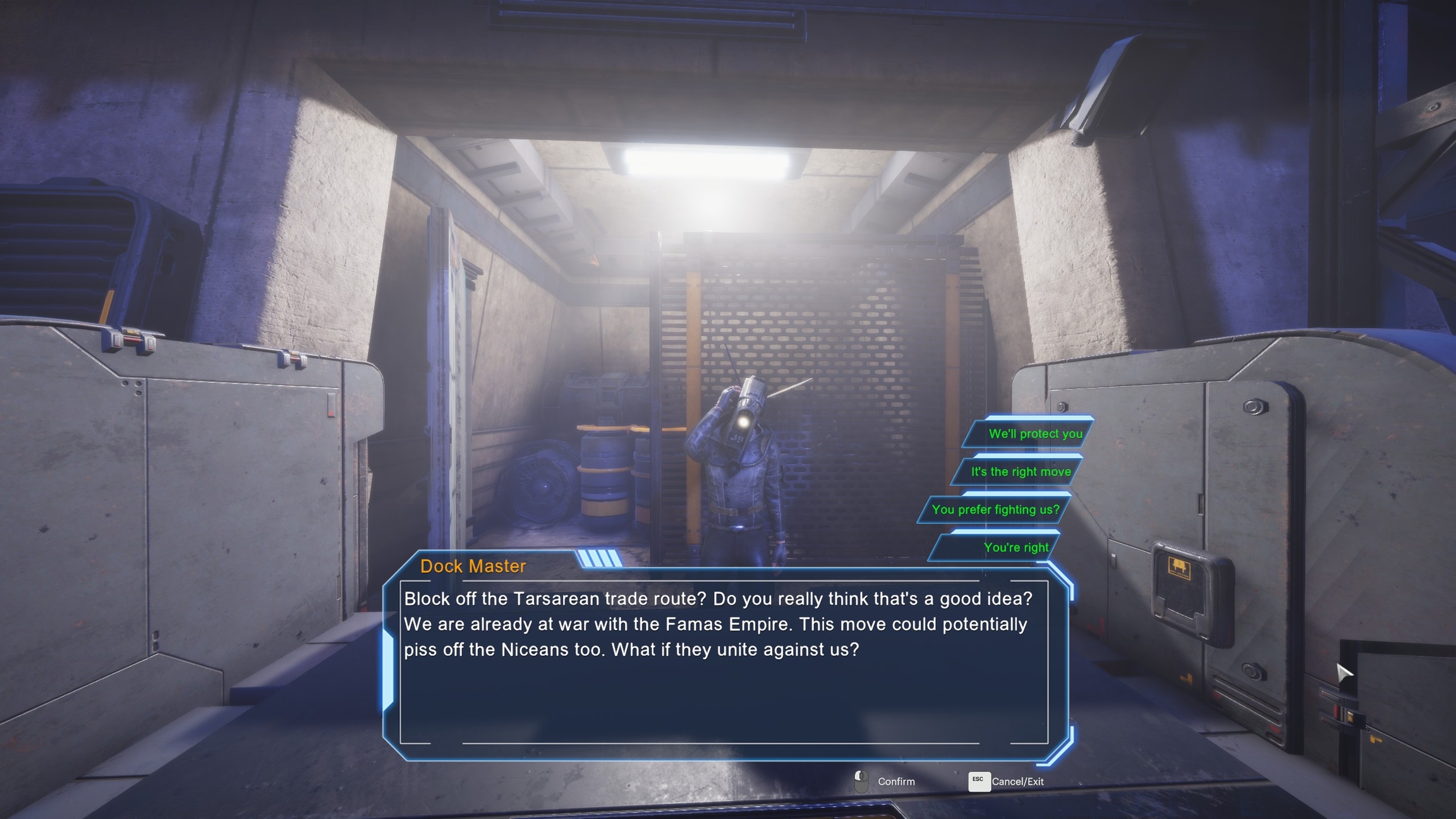 The characters in the EFAS universe are powered by the Ascendance AI system, which allows each character to have their own aspirations, goals, and behaviors. Each character's attributes, such as happiness and stamina are also updated in real-time depending on their actions, other characters' actions, and players' actions. The presence of large numbers of these self-driven characters allows EFAS to be alive. A single player's actions can create large ripple effects throughout the entire galaxy.